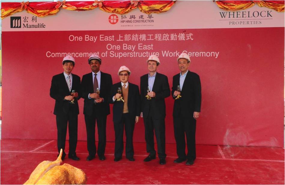 由会德丰地产悉心打造的临海甲级商厦One Bay East,于日前举行上部结构工程启动仪式,由会德丰地产、宏利人寿保险(国际)有限公司、协兴建筑及王董建筑师事务有限公司代表主持仪式。